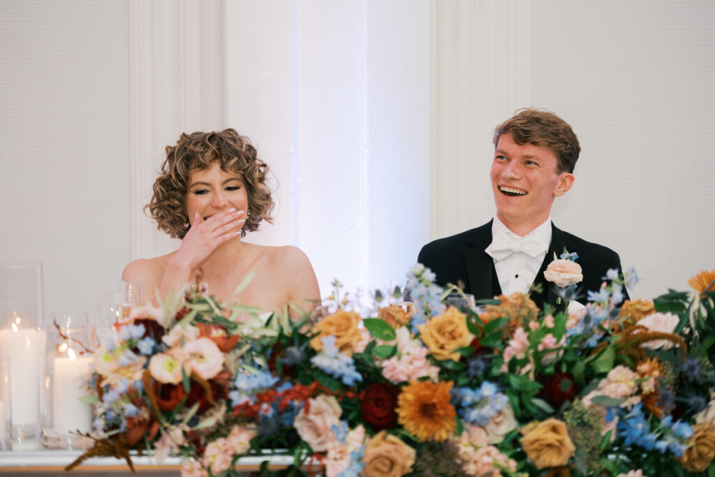 From their modern black and white wedding seating chart to the soft, candlelit reception tables and lush floral arrangements, the design choices were so unique to them. Classic, with some fun and funky touches to add personality.