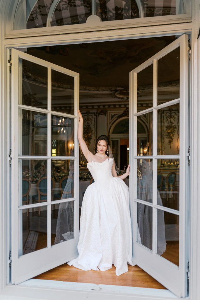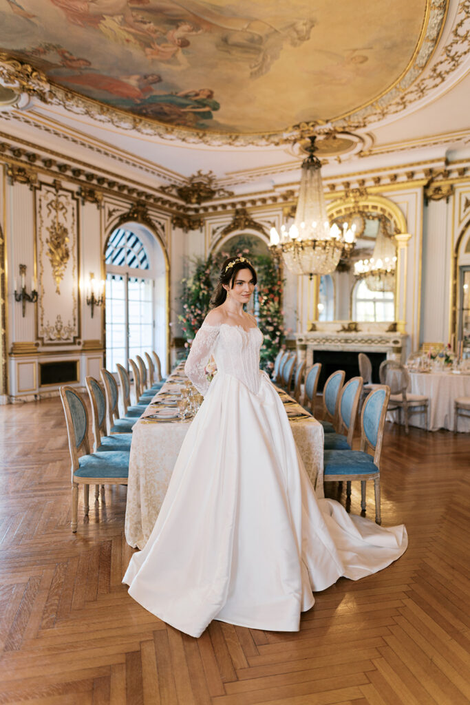 Her second look brought the drama with an off-the-shoulder lace dress with a high slit and satin skirt. Both gowns felt tailor-made for the grandeur of Elkins Estate and totally satisfied my Bridgerton loving heart.